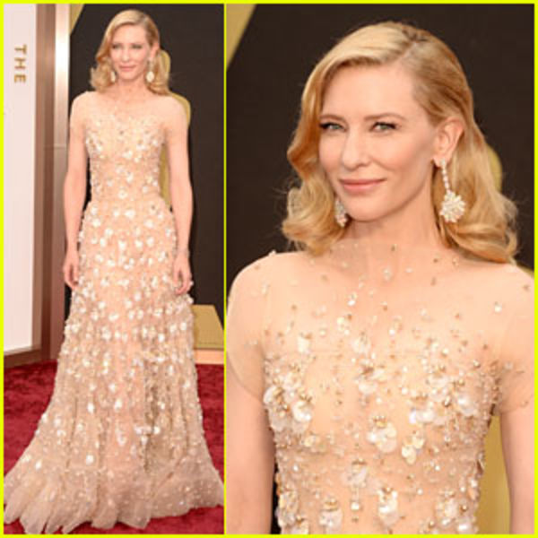 Cate Blanchett: Veste un abito con base tulle carne, con applicazioni a ricamo di strass ed è ricoperto da paillette grandi e graduali; questa volta rispetto alle altre, mi piace meno e mi aspettavo più eleganza da lei. Comunque la sua bravura fa passare tutto il resto in secondo piano, il suo Oscar è meritato.