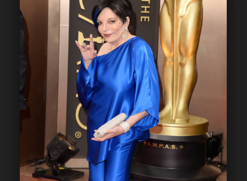 Liza Minnelli: è in abito bluette, sta molto bene con questo colore l’ha perfino richiamato con una striscia sui capelli in tono blu.