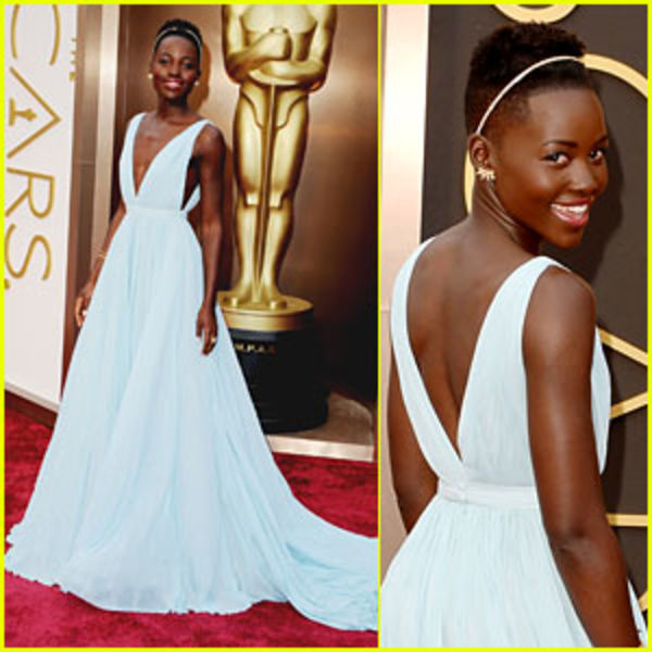 Lupita Nyong’o, ha un abito molto bello, è bianco, ha una scollatura morbida e profonda sul davanti e sul dietro, di tessuto di chiffon plissé molto ampio che le sta veramente bene. Risalta enormemente la sua figura slanciata e la sua carnagione, l’idea della coroncina in testa è giusta poiché ha i capelli corti quasi rasati, da un tocco in più di femminilità, anche se non ne ha bisogno nell’insieme… è felina.
