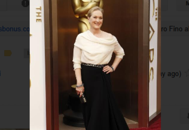 Meryl Streep: che classe con la sua semplicità, indossa un completo formato da una maglia leggerissima forse maglina di seta bianco latte e la gonna lunga nera, tutto le cade perfettamente con le giuste morbidezze, sulla vita rifinisce lo stacco tra i due abbinamenti, una cintura a catenella di metallo elegante. Sta veramente bene la nostra amata Meryl.