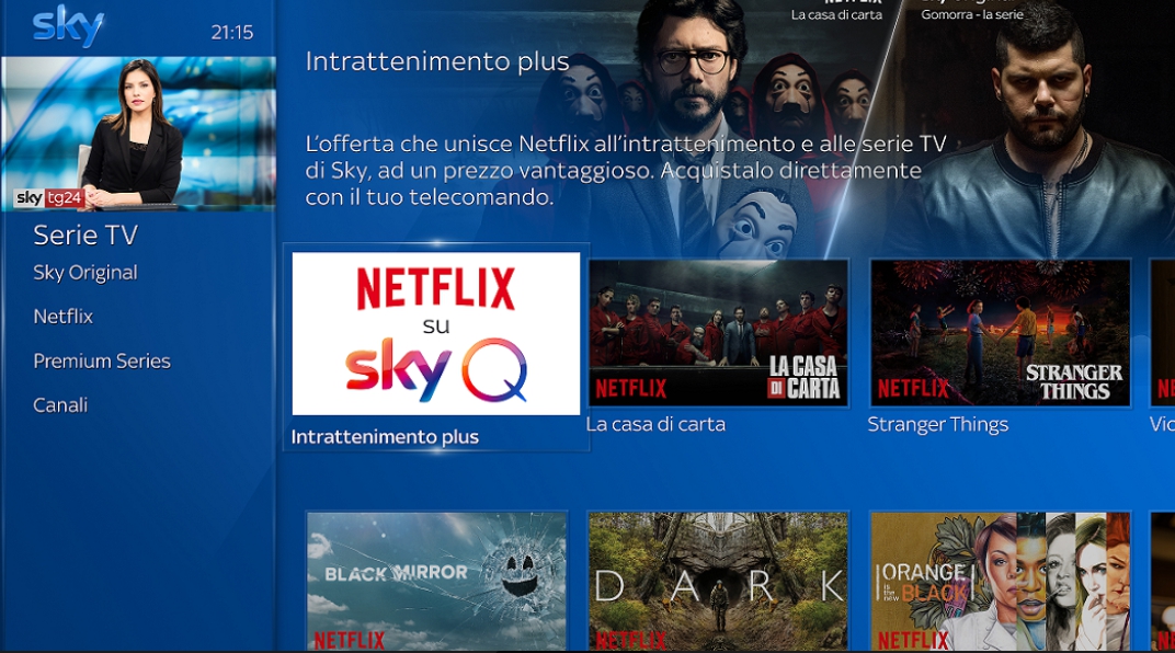 Chi ha già un abbonamento Netflix potrà decidere di sottoscrivere Intrattenimento plus, anche mantenendo il proprio profilo Netflix, per beneficiare dell’esperienza di visione di Sky Q e dei vantaggi di prezzo di questa offerta, oppure potrà fruire del servizio Netflix direttamente attraverso l’app disponibile su Sky Q.