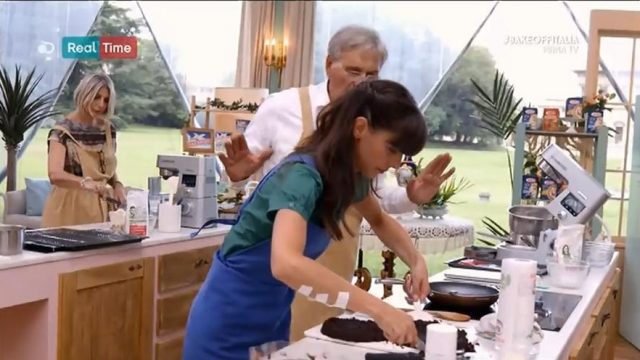 Benedetta Parodi si aggira tra le postazioni, scherza con gli aspiranti pasticceri utilizzando parole antiche.