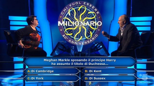 Tiziana sceglie di utilizzare l’aiuto del “50:50”, che però non l’aiuta perché lascia le due opzioni su cui era incerta. Tuttavia, opta correttamente per la “D”, “Sussex”.