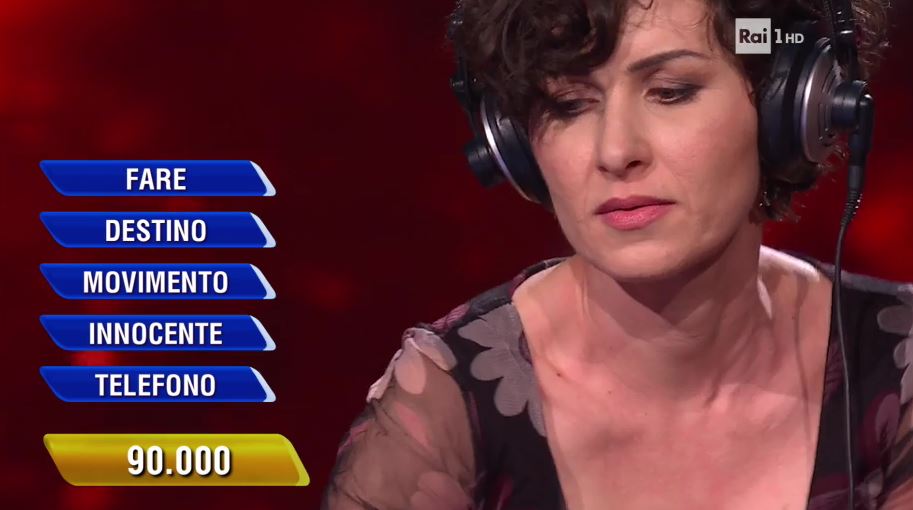 Dopo un attimo di incertezza la campionessa ha scritto ed ha successivamente mostrato la parola “scherzo“. Ma quando ha spiegato i motivi della sua decisione è apparsa alquanto in imbarazzo. Non riusciva cioè a specificare il nesso che ci fosse tra “movimento” e “scherzo”. Ci ha pensato Flavio Insinna a spiegare che lo scherzo è un movimento musicale. E così con grande sorpresa della stessa Valentina Bernocco, Insinna le ha comunicato l’esattezza della sua risposta. 90.000 euro erano nelle casse della vincitrice.