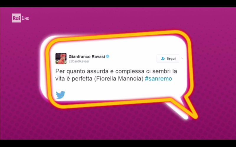 Arrivano Clementino, Ermal Meta e Fiorella Mannoia. “Che sia benedetta Fiorella”, afferma la Gialappa’s. La sua canzone è stata retwittata dal cardinale Ravasi.