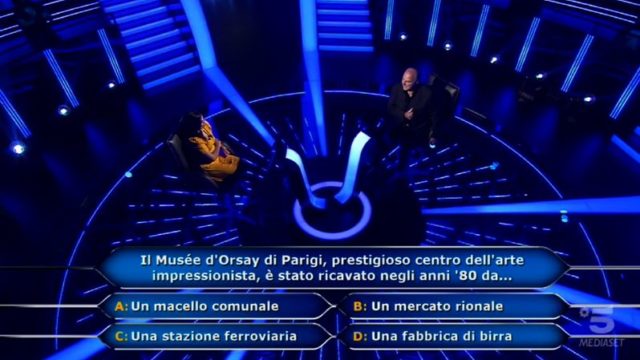 Il quesito: “Il Musée d’Orsay di Parigi, prestigioso centro dell’arte impressionista, è stato ricavato negli anni ’80 da…”. Opzioni: A) Un macello comunale; B) Un mercato rionale; C) Una stazione ferroviaria; D) Una fabbrica di birra.