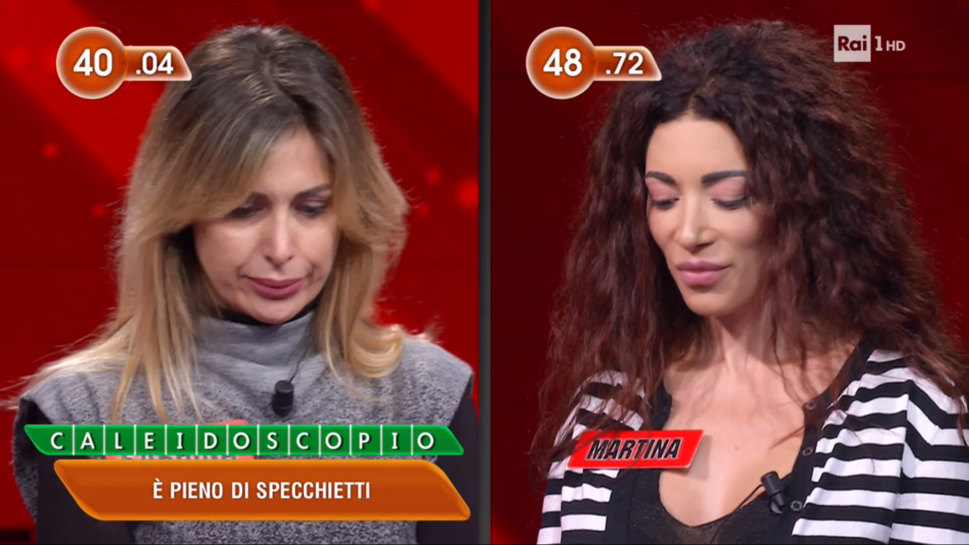 Inizia il gioco. La prima scelta è fra Favola e Scatola. La risposta corretta è Scatola, che Martina indovina. Poi, Uomo o Uovo. Martina sceglie Uovo, ancora una volta la risposta esatta. Quindi, tra Invitare o Imitare Martina seleziona Invitare, di nuovo giusta. La scelta tra Benedizione e Beneficienza porta in errore Martina, che sceglie Benedizione. La risposta corretta era Beneficienza. Infine, Cinque o Lingue. Martina indovina con la parola Cinque, e tenta di indovinare la parola che collega tutti i termini per 80.000 Euro.