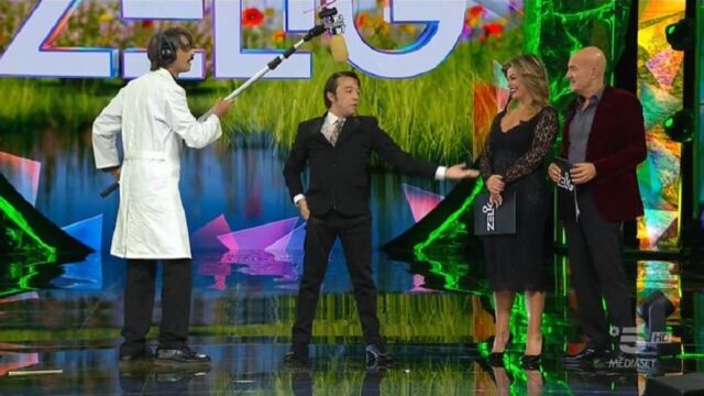 Simone Barbato si presenta con la sua classica tutina nera attillata. Porge un bigliettino accartocciato a Claudio Bisio per leggerlo. Bisio indica degli elementi come il semaforo, il termometro e Barbato li mima. Tra questi c’è anche “l’ultimo capello di Bisio pettinato”.