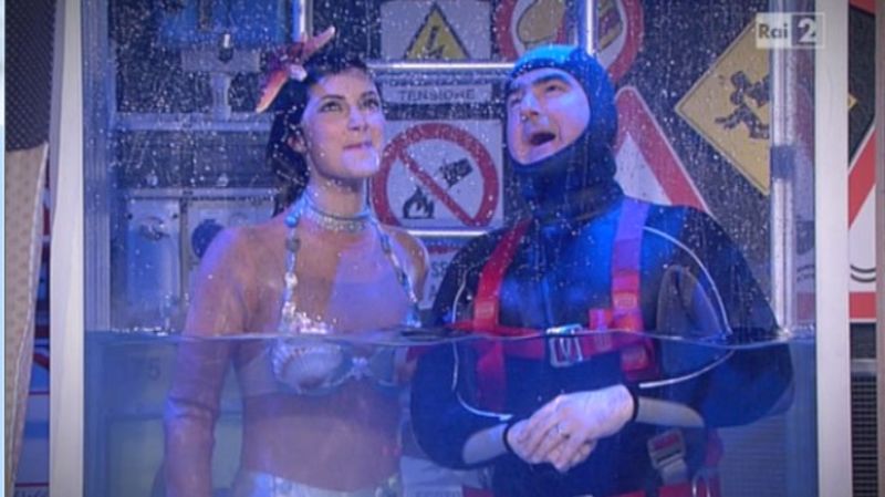 È la volta della “Musica dagli abissi”, con Mangoni impegnato a sedurre una sirena chiusa insieme a lui nella vasca. Frankie Hi-Nrg riconosce il brano cantato sott’acqua “All You Need Is Love”.