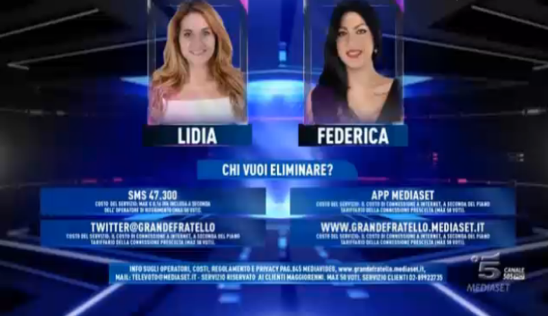 Le gemelle sono combattute e alla fine Lidia si immola. Federica è l’altra ad andare in nomination. Si preannuncia un televoto infuocato tra le due (ex?) nemiche in amore. Per Malgioglio non ci sono dubbi: sarà Lidia ad abbandonare il gioco giovedì prossimo. Secondo Claudio Amendola la sfida, invece, è apertissima.